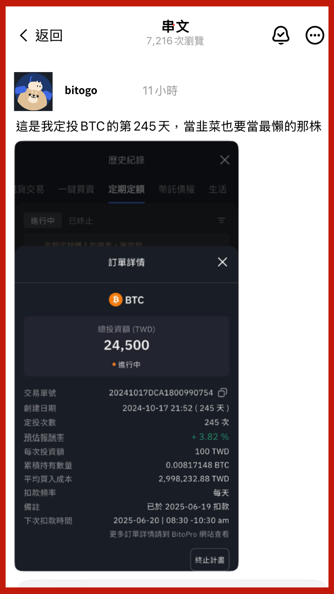 1. 截圖你的BitoPro定投頁面 (交易單號/投資金額可隱藏)2. 在Threads發布串文,開頭為「這是我定投[幣種]的第XX天」,並用1句話說明堅持定投的原因3. 串文突破100次瀏覽後填寫本表單,72小時內審核通過後即得4點!